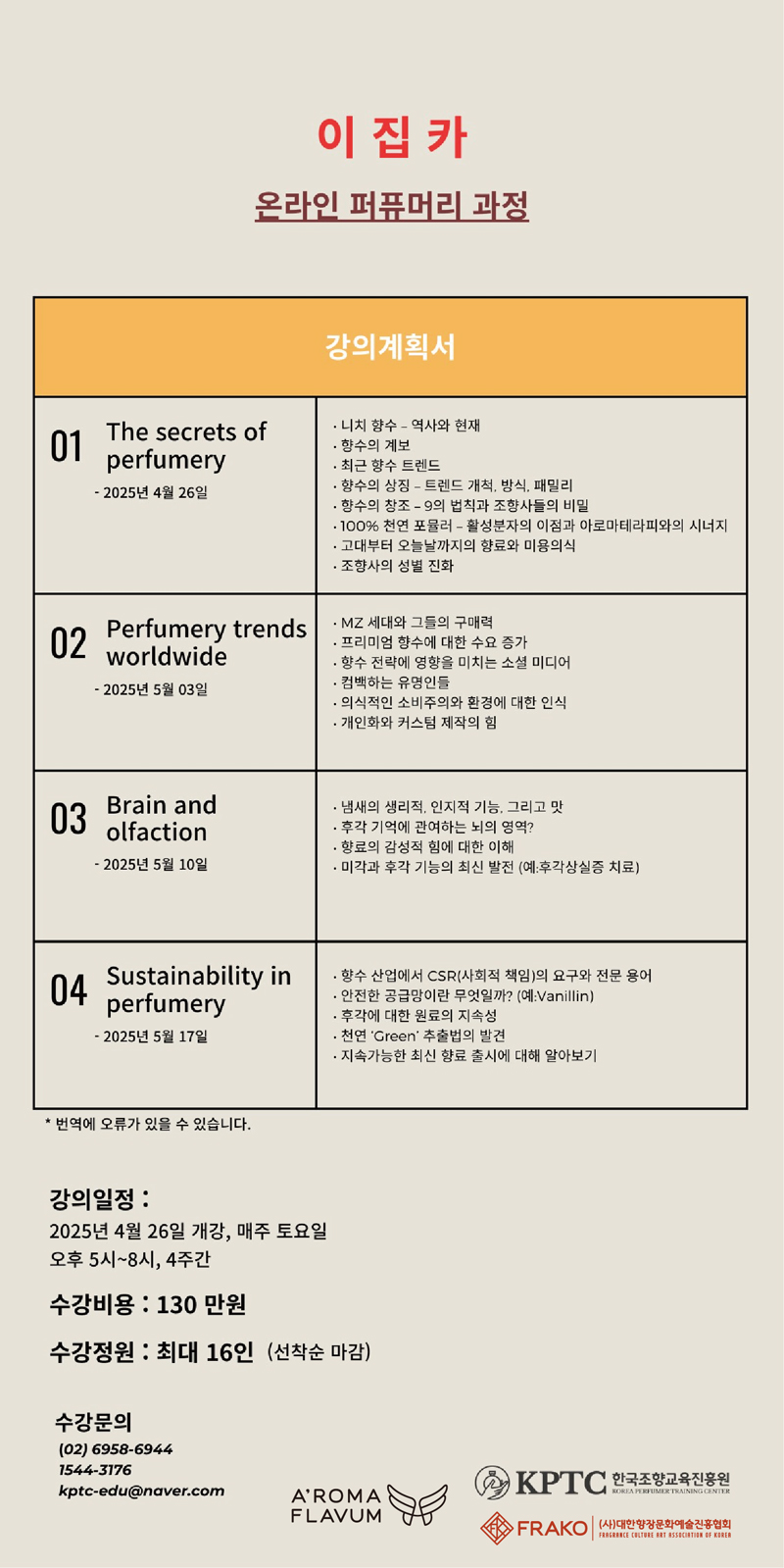 지난 이집카(ISIPCA) 온라인 퍼퓨머리 1차 교육에 보내주신 뜨거운 관심과 참여에 깊이 감사드립니다.